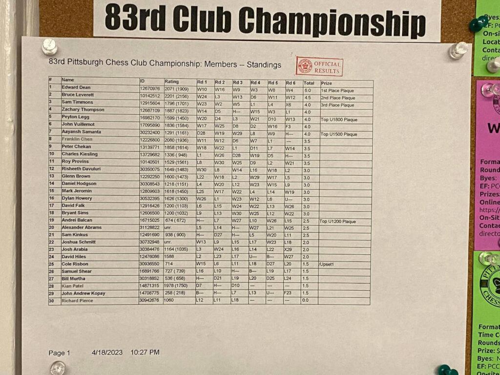 Congratulations to the 1st place winner of our 2023 Pittsburgh Chess Club Championship, now six-time Club Champion, Edward Dean with a perfect score!